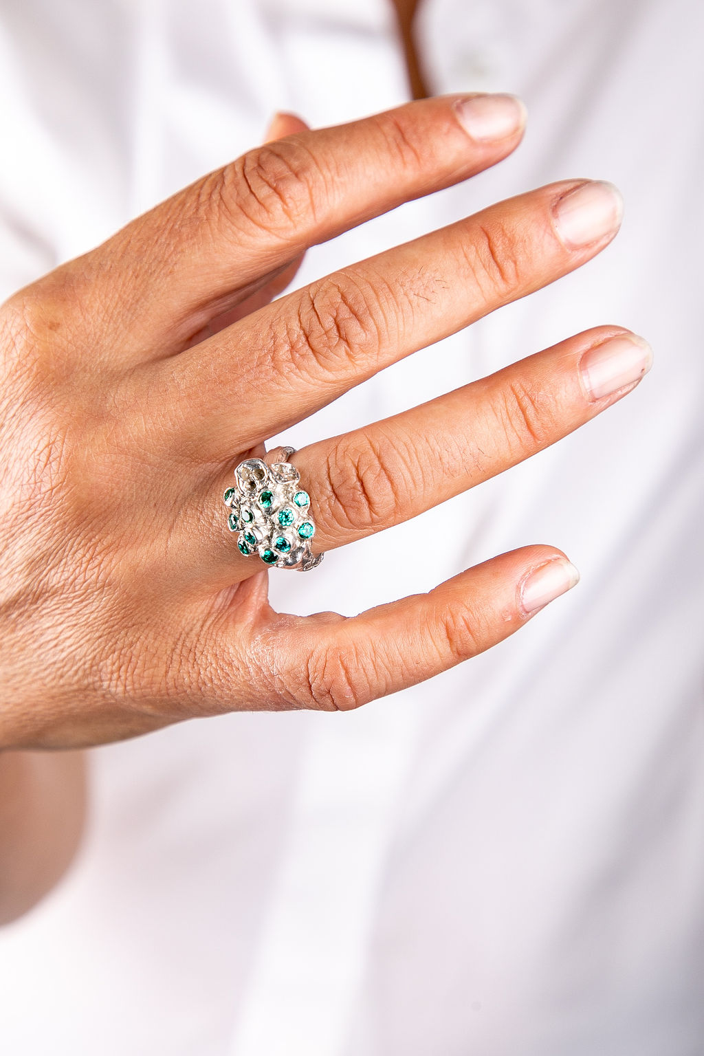 טבעת בעבודת יד, ניצוקה מתרמיל אקליפטוס ,משובצת באבנים רבות היוצרות קומפוזיציה טבעית ועשירה. העיצוב מעניק תחושה של תנועה חיה ודינמית, תכשיט מלא אופי ונוכחות.