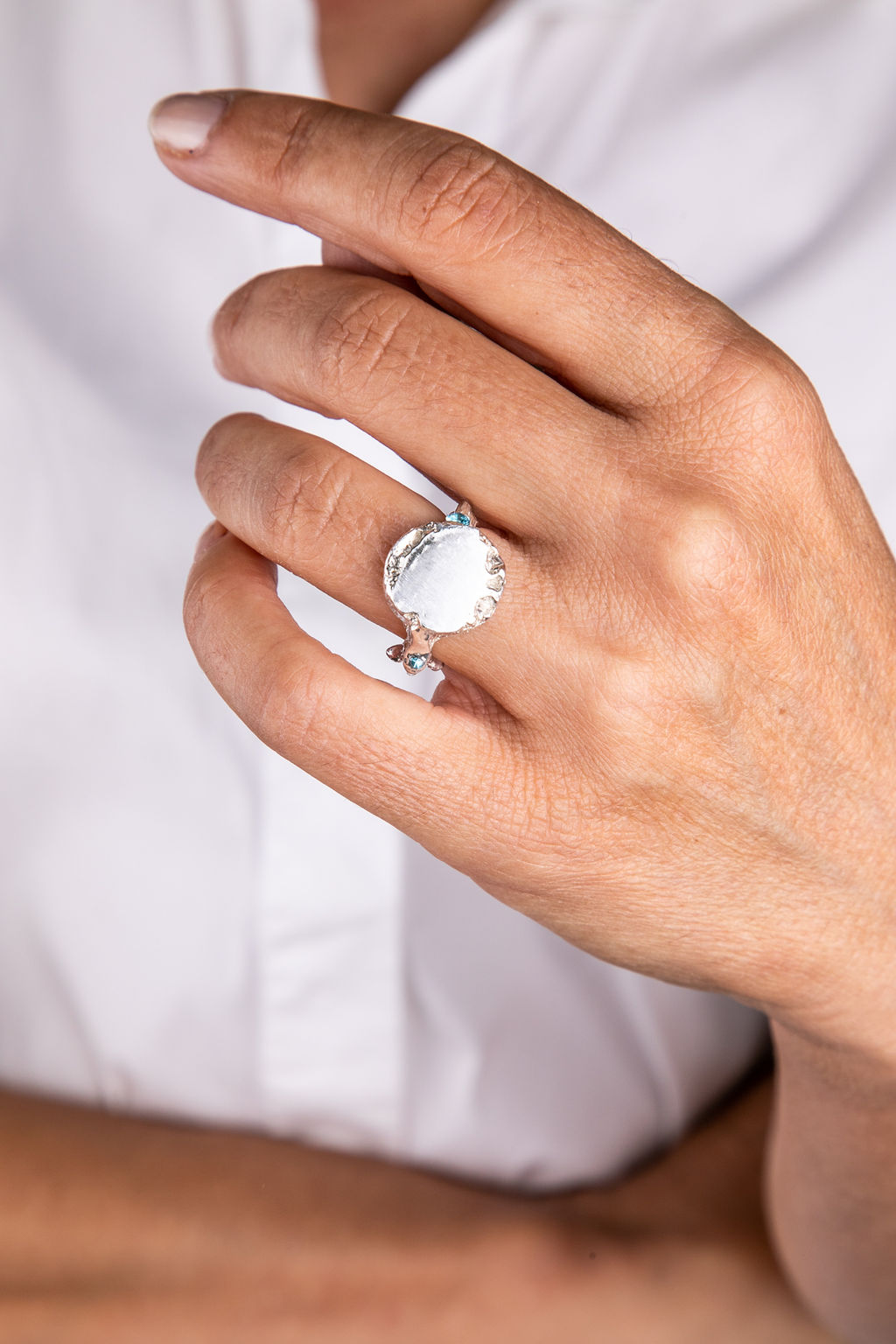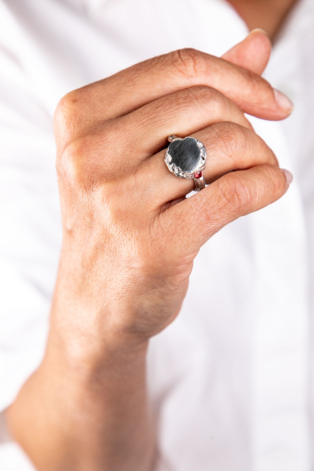 <טבעת עוצמתית וייחודית בעיצוב אורגני, שמשלבת מראה גולמי עם נגיעה אלגנטית