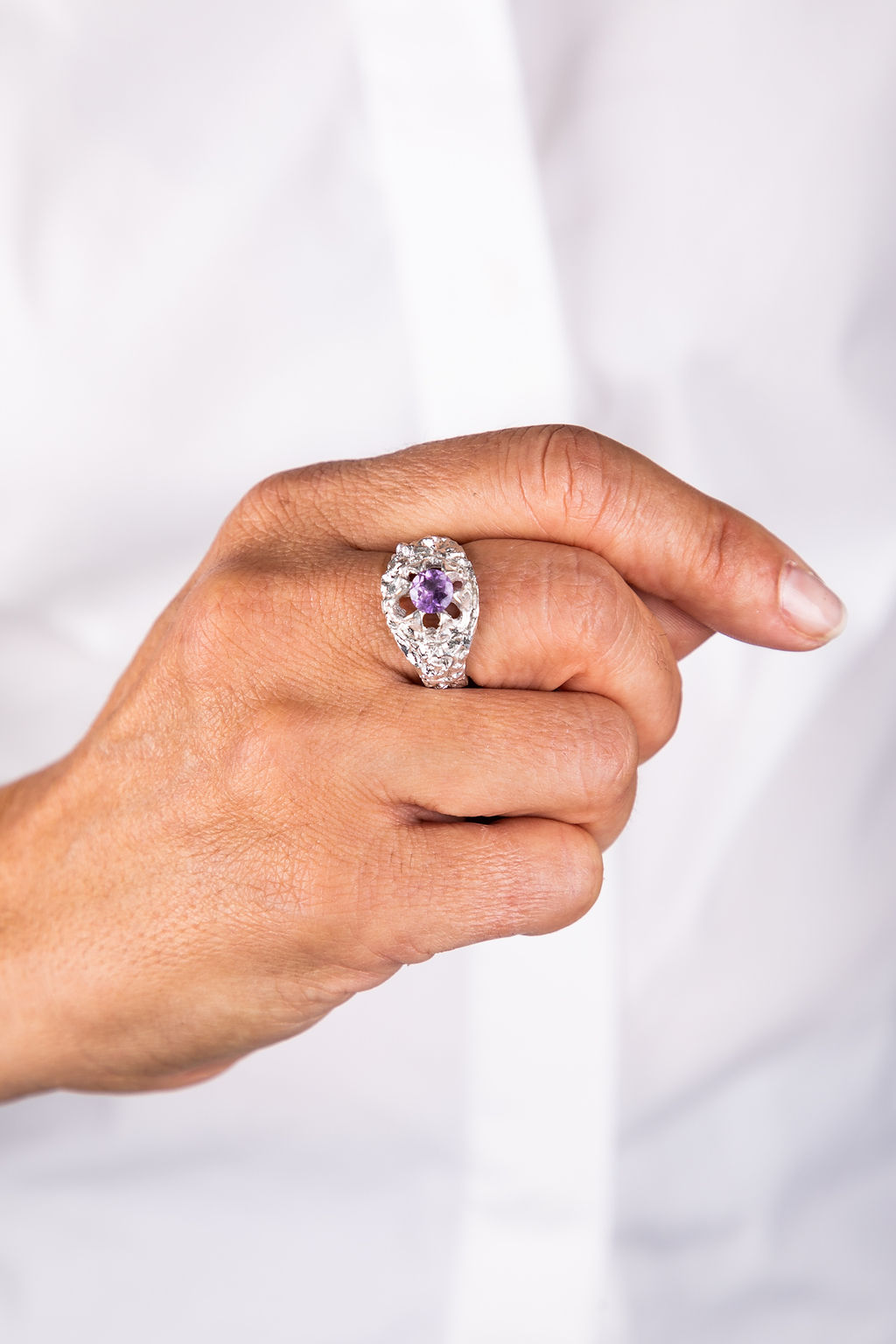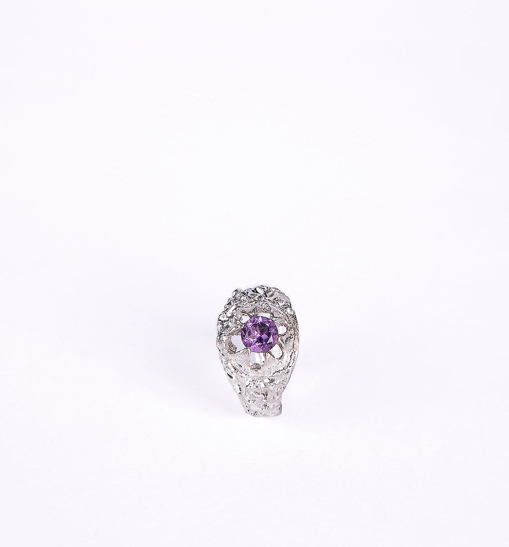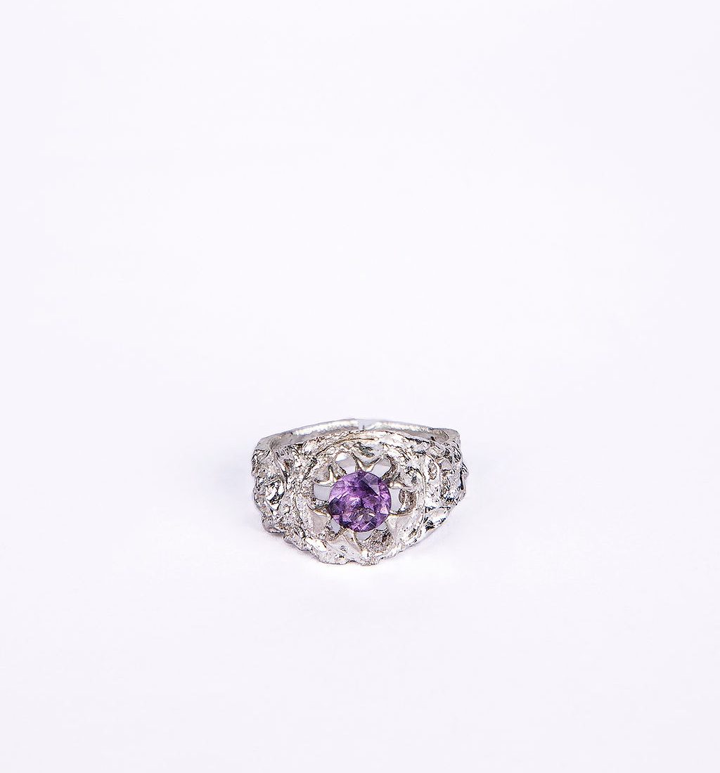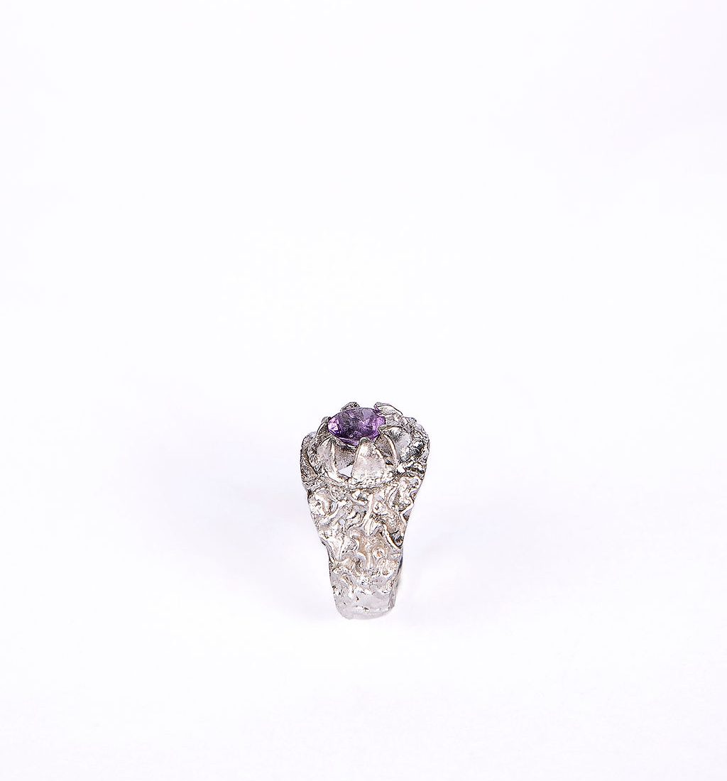 טבעת כסף אומנותית בעבודת יד,משלבת שני אלמנטים בוטניים משובצת אבן מרכזית מרשימה עם אפשרות לשיבוץ אבנים קטנות המשולבות בעדינות מסביב. המבנה האורגני והייחודי מעניק לטבעת אופי חזק ועדין בו־זמנית