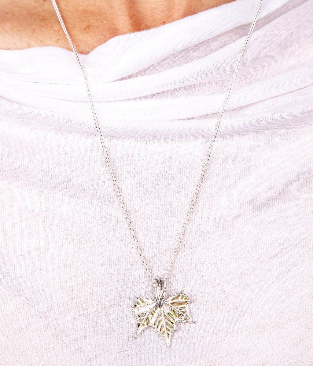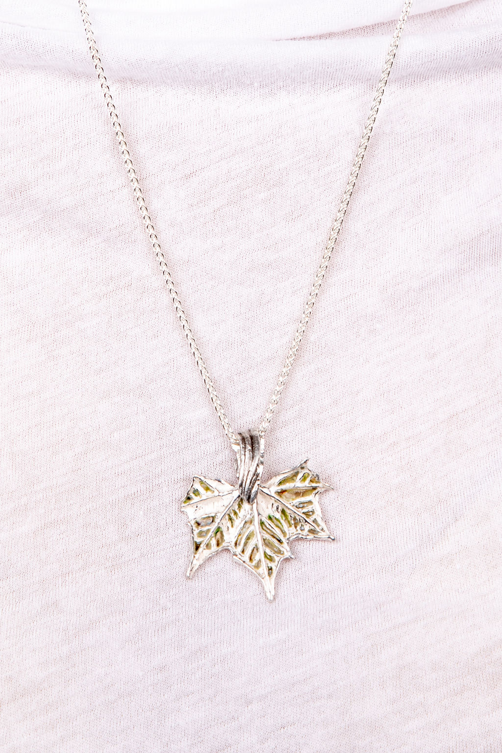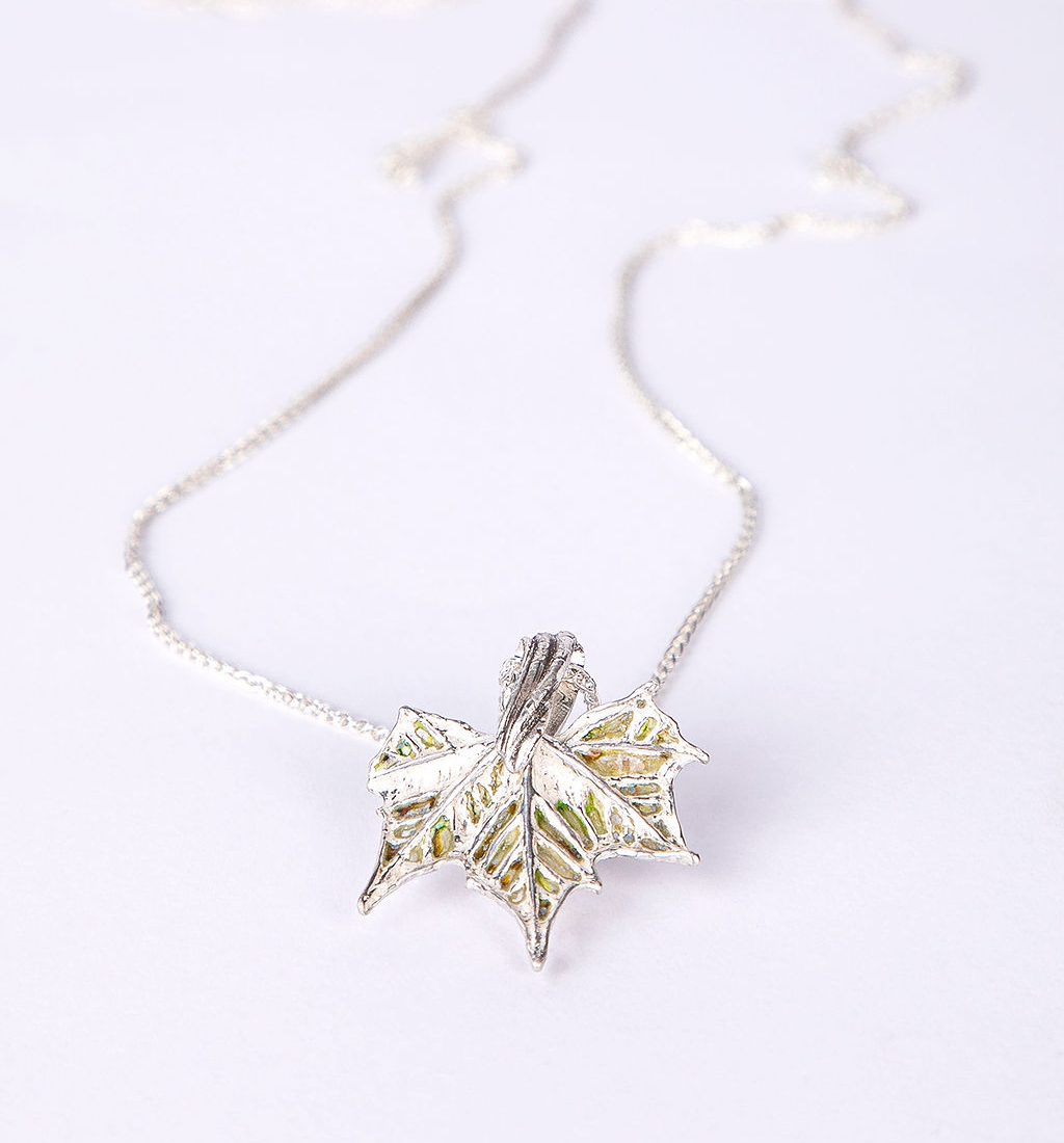 תליון שלד עלה עם מתלה עדין, מעוטר באמייל צבעוני בגוונים ירקרקים־זהובים. שילוב של פיסול אורגני וטכניקה עדינה, שהופך את העלה הטבעי ליצירה עכשווית שנושאת עמה זיכרון של טבע חי.