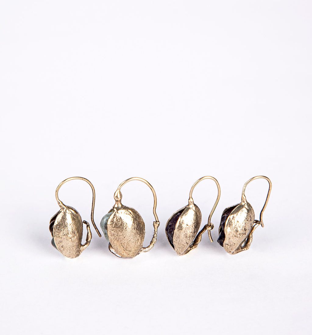 עגילים תלויים בעיצוב תרמילי זרעים המכילים אבני חן גולמיות-זרעים חדשים! היוצרות משחק צבע ייחודי. עגיל לעתיד חדש.
