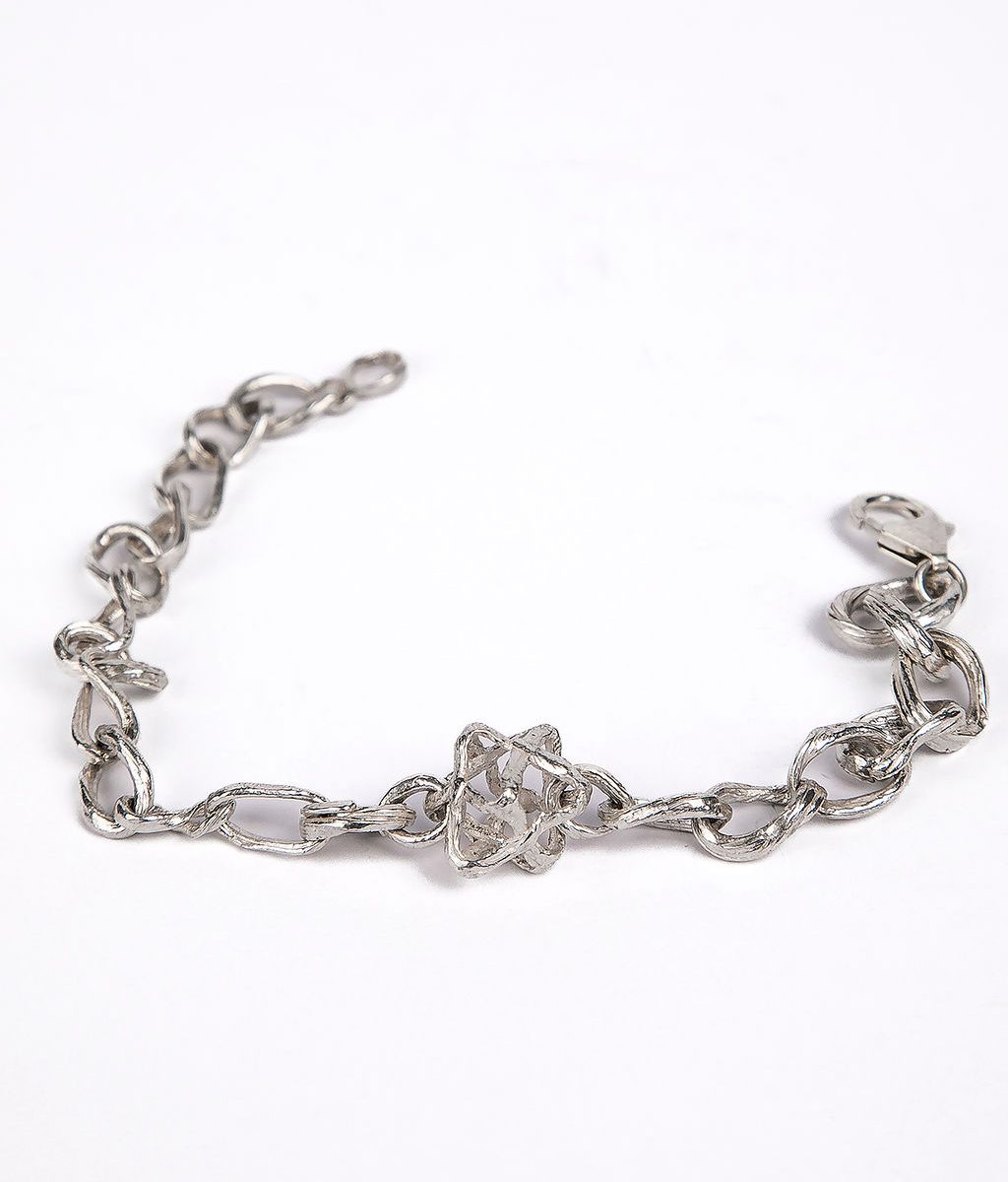 צמיד כסף בעבודת יד, עשוי בטכניקת Mitsuro Hikime – אמנות יפנית עתיקה לעיבוד שעווה. כל חוליה נוצקה משעווה חמה שנמתחה וקופלה ביד, וכך נוצרו הקווים האורגניים והמרקם הייחודי. במרכז הצמיד שולב סמל המרכבה , סמל של חיבור בין שמיים וארץ- קישור בין גוף לרוח.