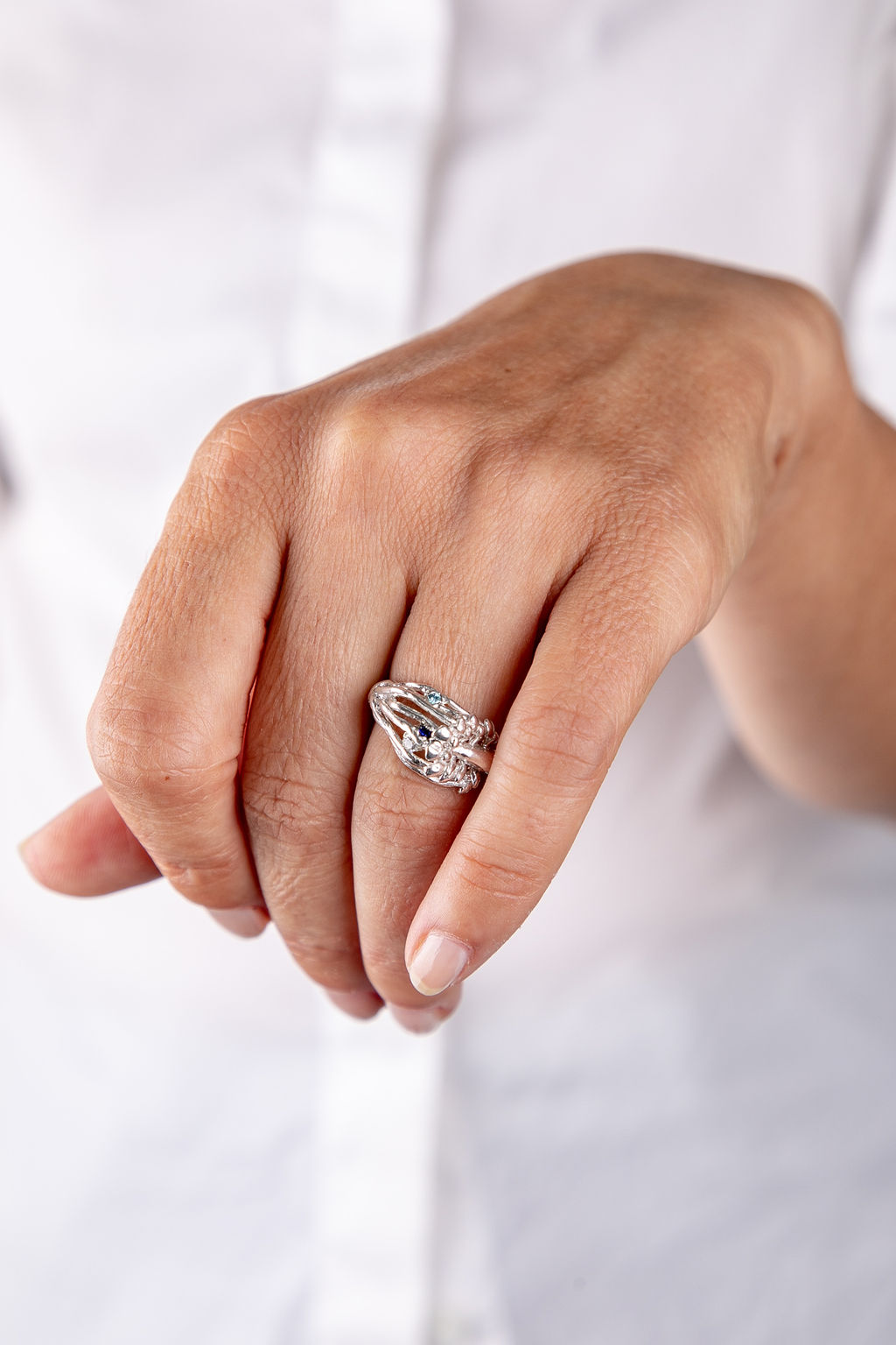טבעת בעבודת יד בעיצוב אורגני ועדין, עם שיבוץ אבני חן שמוסיף אור ונוכחות מבלי להיות בולט מדי.