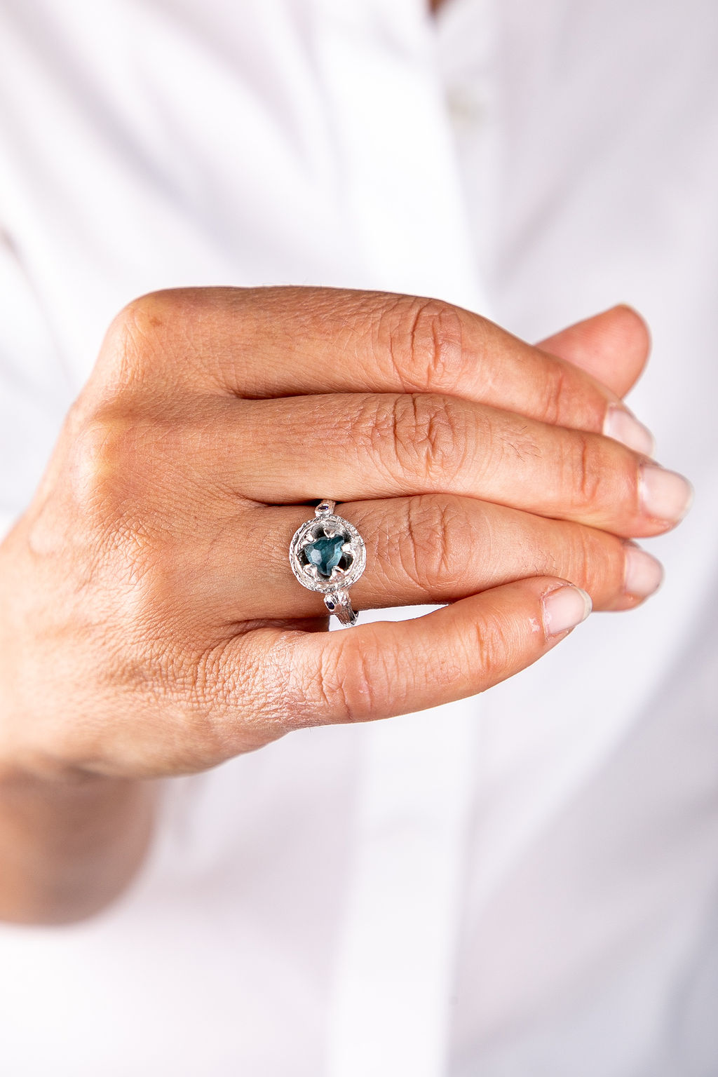 העיצוב האורגני משלב קווים טבעיים עם שיבוץ אבנים, ויוצר תכשיט שמרגיש חי, אישי ומלא עומק.
