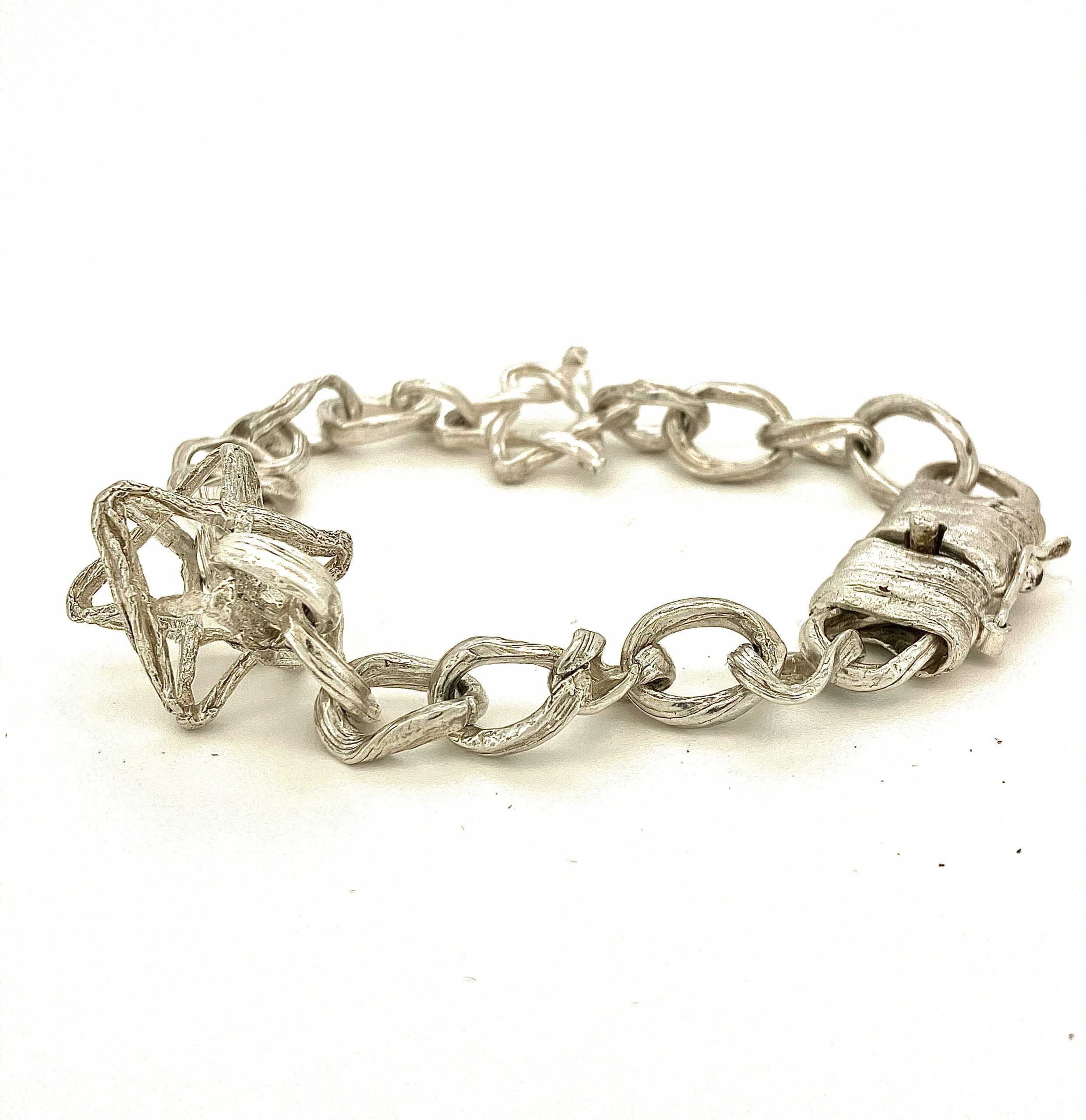 צמיד חוליות כסף ייחודי, בעיצוב בעבודת יד ובטכניקת Mitsuro Hikime – שיטת שעווה יפנית עתיקה. יצרתי כל חוליה שבתוכה קווים טבעיים ומתפתלים, שנמתחים ביד באמצעות עבודת שעווה חמה,כך שכל חוליה היא ייחודית לגמרי. גם מגן הדוד והמרכבה נוצרו כך והם משתלבים כחלק אורגני מתוך השרשרת,