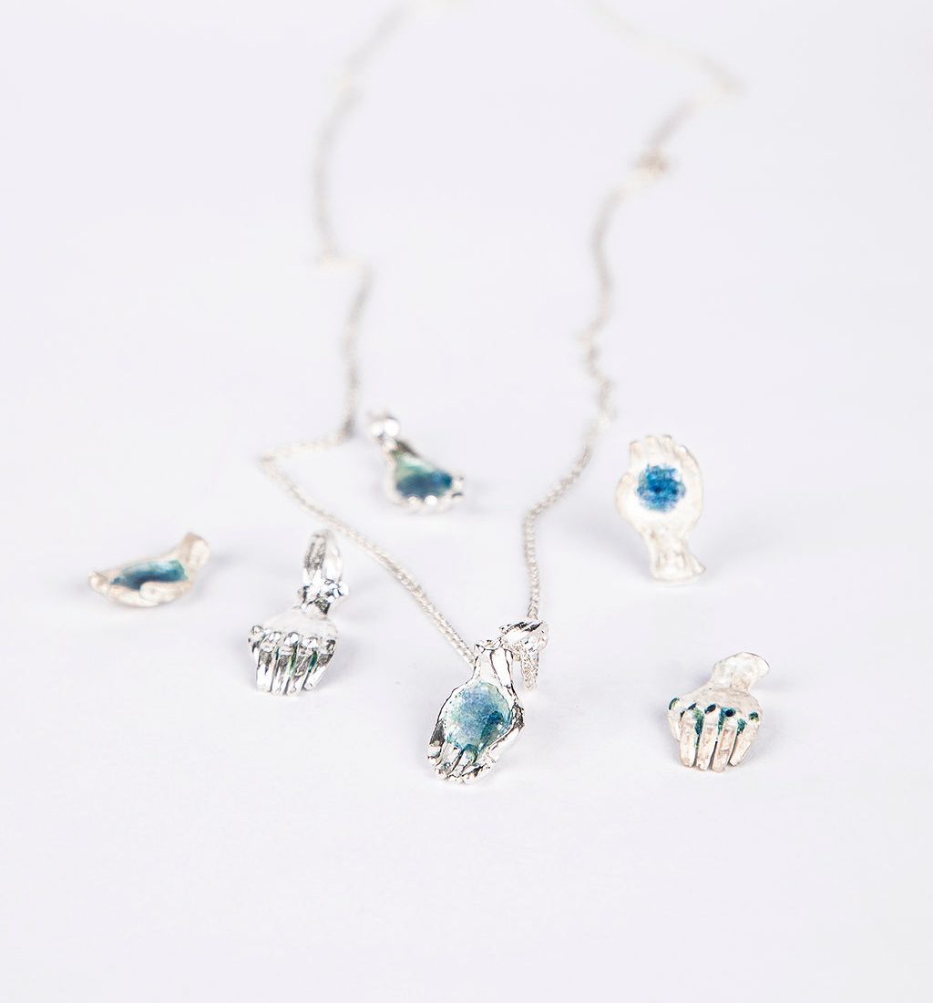 תליון יד מקבלת שבתוכה נמסכה שכבת אמייל בגווני כחול־טורקיז, המדמה שלולית מים חיים הממלאים כלי, היד הפתוחה מזמינה שפע, נדיבות -יכולת לקבל לתת באהבה.