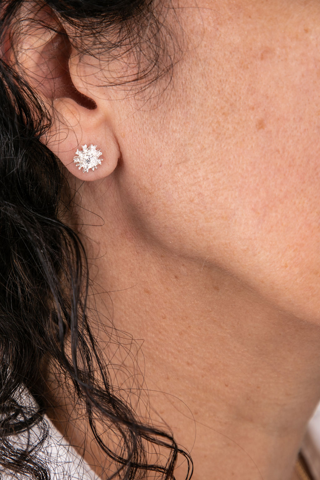 עגיל כסף עדין בעבודת יד, ניצוק מפרי עץ הקזוארלה ,משובץ באבן מרכזית ומוקף בפרטים עדינים המדגישים את הזוהר הטבעי. עיצוב אלגנטי עם איזון הרמוני בין עדינות לנוכחות.