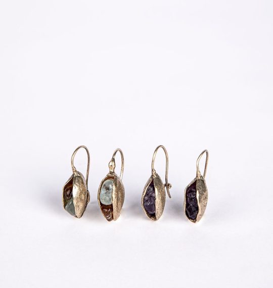 עגילים תלויים בעבודת יד, בהשראת תרמילי זרעים, שבתוכם משובצות אבני חן גולמיות.