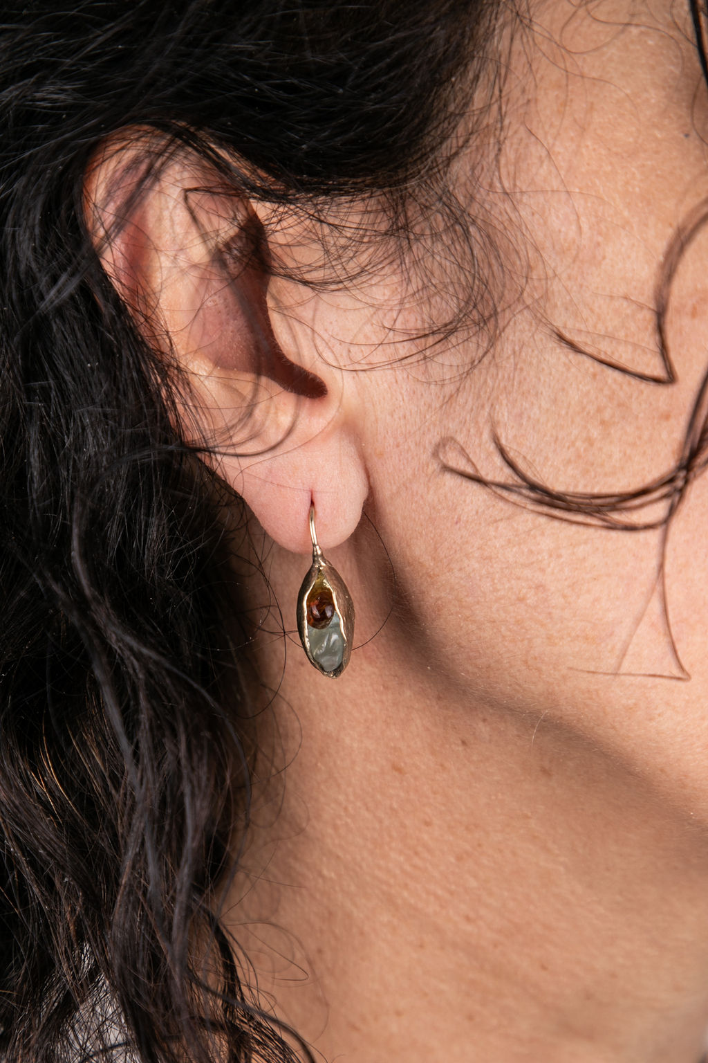 עגילים תלויים בעיצוב תרמילי זרעים המכילים אבני חן גולמיות-זרעים חדשים! היוצרות משחק צבע ייחודי. עגיל לעתיד חדש.